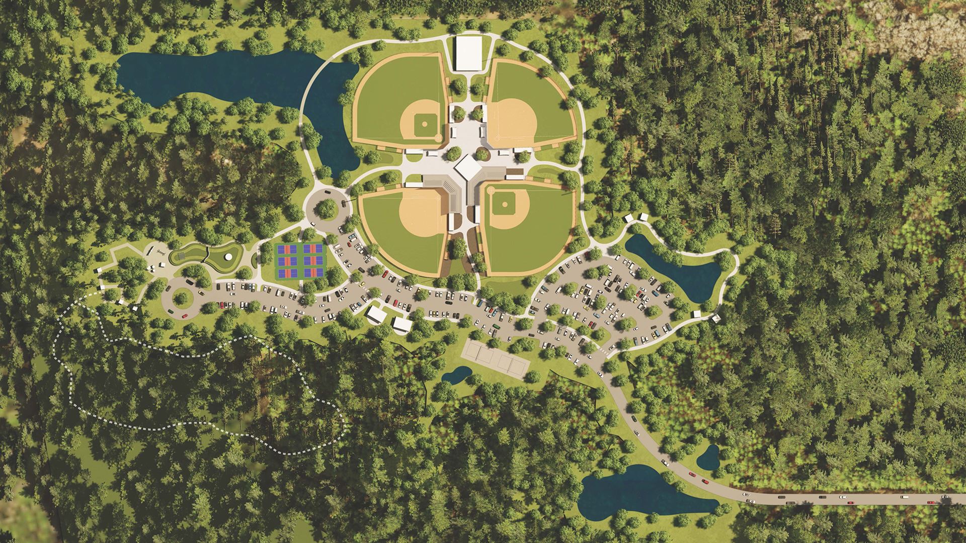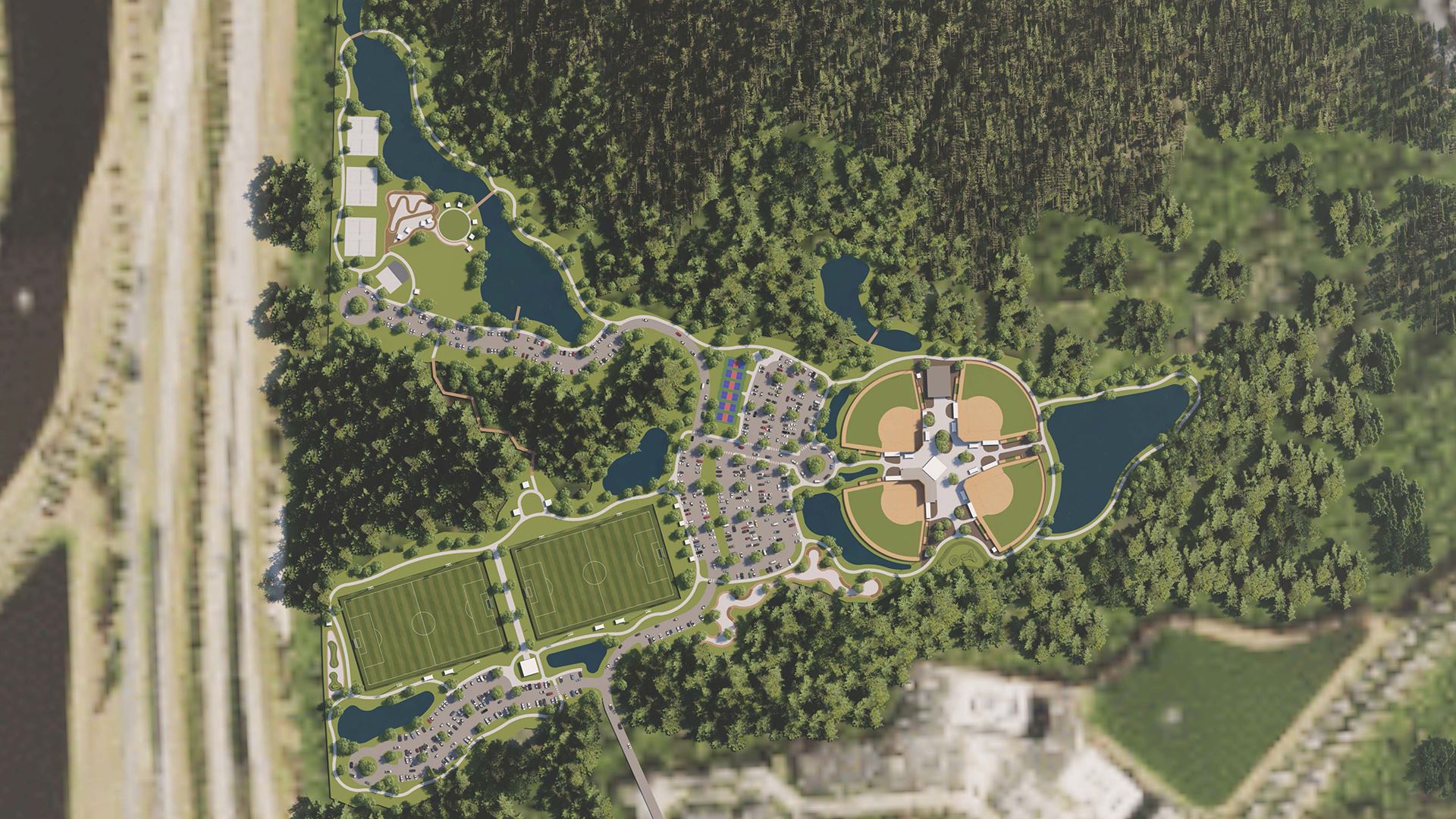 - Central Sportsplex: Five multipurpose fields with synthetic turf fields, three natural grass multipurpose fields, areas designated for tailgating, ticketing and food trucks, and grandstands with a press box.