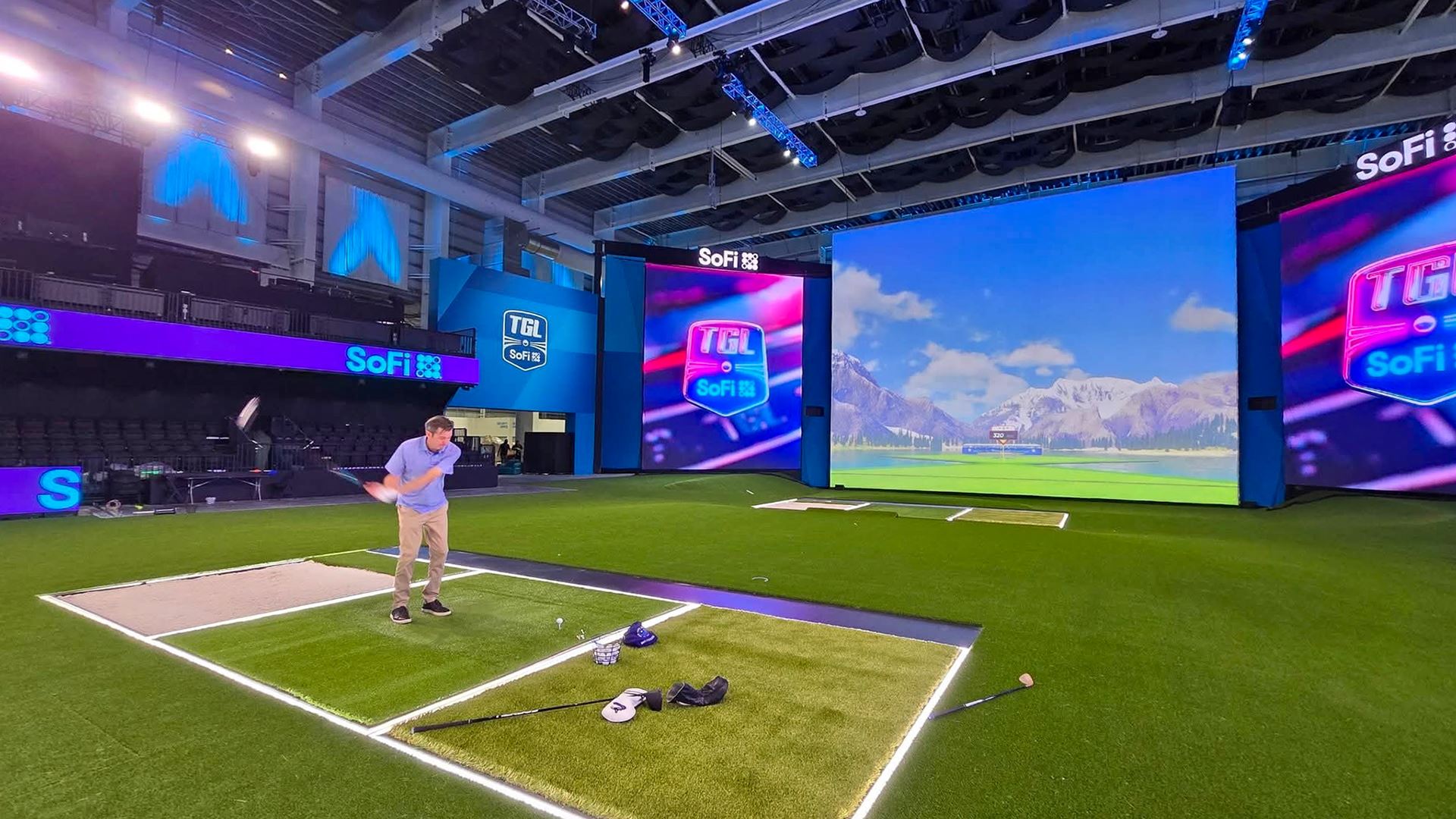 The nearly 250,000 square-foot SoFi Center can accommodate up to 1,500 fans on match nights during TGL’s season. Spectators will have an up-close view of the action and numerous screens and feeds for player performance data will create a high-energy atmosphere.